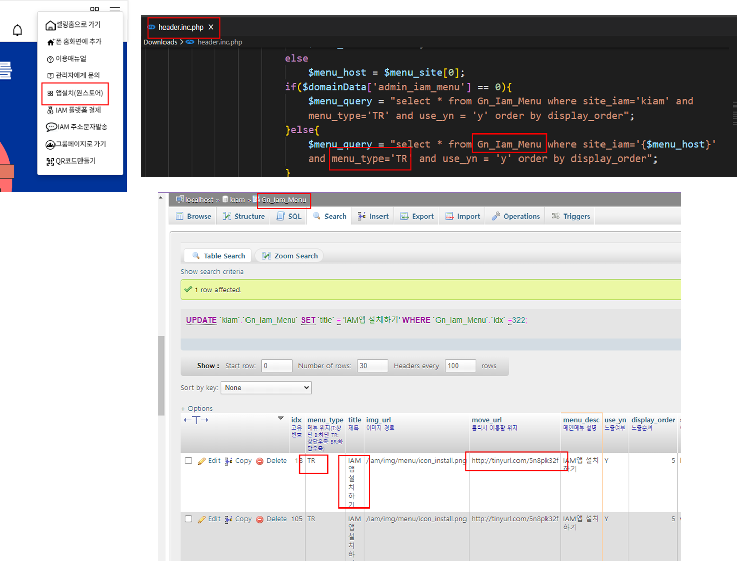 아이엠 우측 상단 메뉴 수정(앱설치 링크)